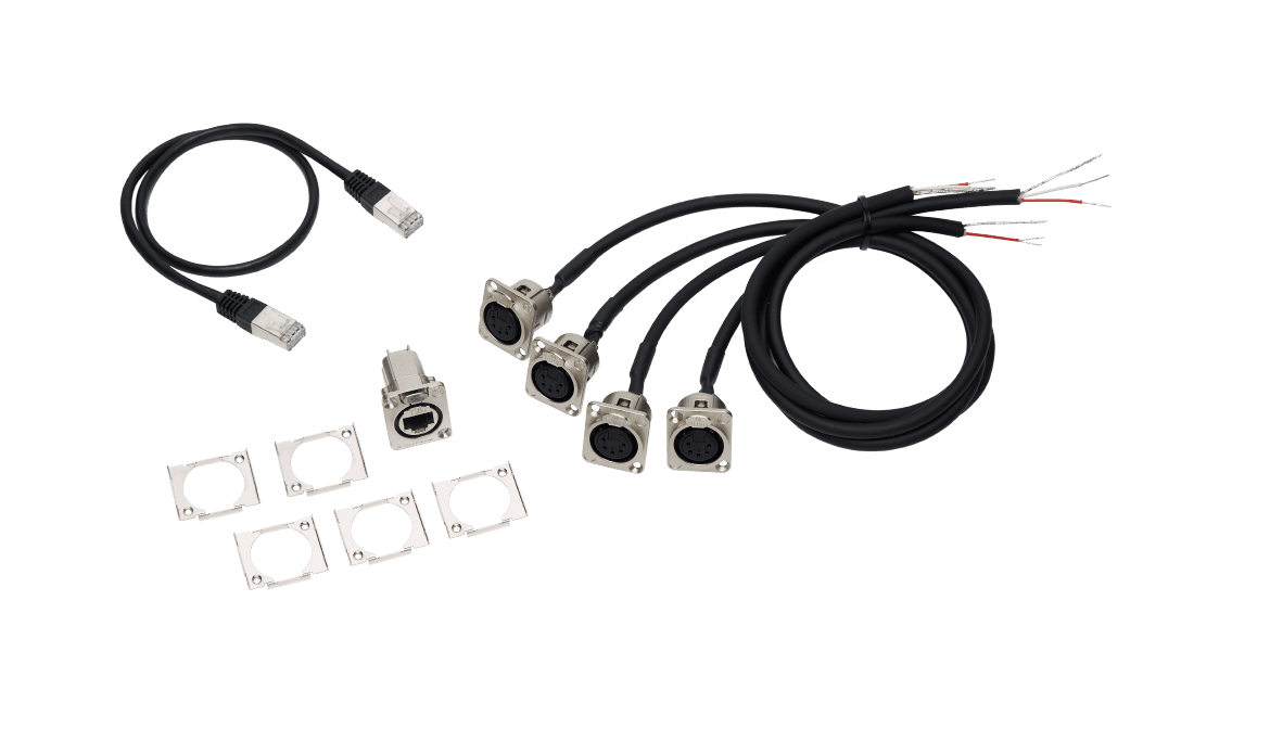 Adapter cable set for grandMA3 4Port Node DIN-Rail, DMX via XLR 5pin (4x cable DMX/XLR5 (length 0.5m), 1x cable RJ45, 1x built-in socket etherCON/RJ45 to RJ45)